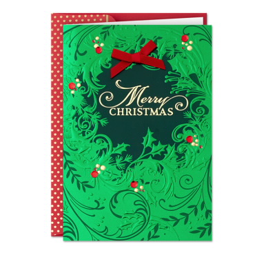 Front: Merry ChristmasInside: Wishing you the spirit of Christmas which is joy, the hope of Christmas which is peace, the heart of Christmas which is love.