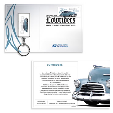 Outfit your keys with the Lowriders Keychain. The keychain highlights the blue 1946 Fleetline from the stamp art.