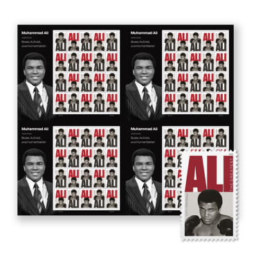 Pay homage to “The Greatest” with the Muhammad Ali Press Sheet without Die Cuts. The press sheet does not include perforations and features bold, striking designs from the Muhammad Ali Forever® stamp sheet.