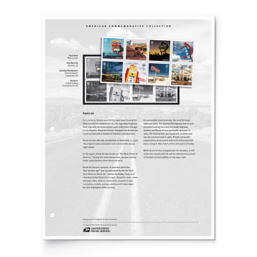 Celebrate the 100th anniversary of America’s legendary highway with this Route 66 American Commemorative Collection Page.The Route 66 American Commemorative Collection Page includes the commemorative stamps from the issuance, protective mounts, and a custom page designed exclusively for the American Commemorative Collections program.