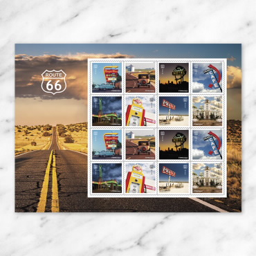 Celebrate the 100th anniversary of America’s legendary highway with the Route 66 Forever® stamps. Available in panes of 16, the stamps feature 8 designs.The Route 66 Forever stamps feature 8 photographs from the states along the iconic highway that originally stretched from Chicago to Los Angeles.